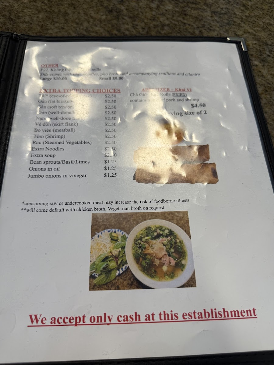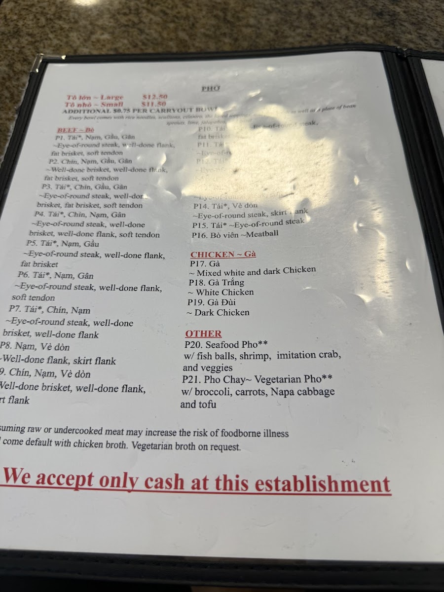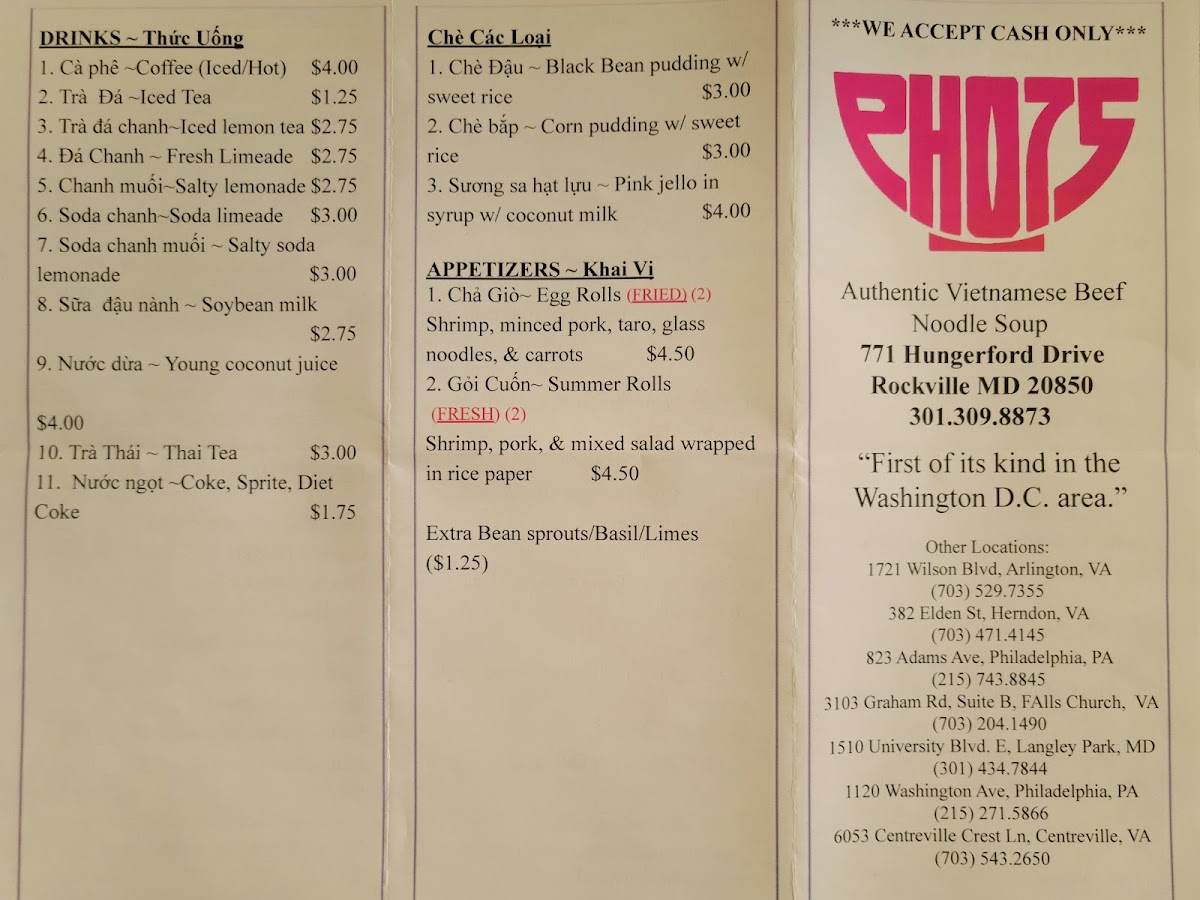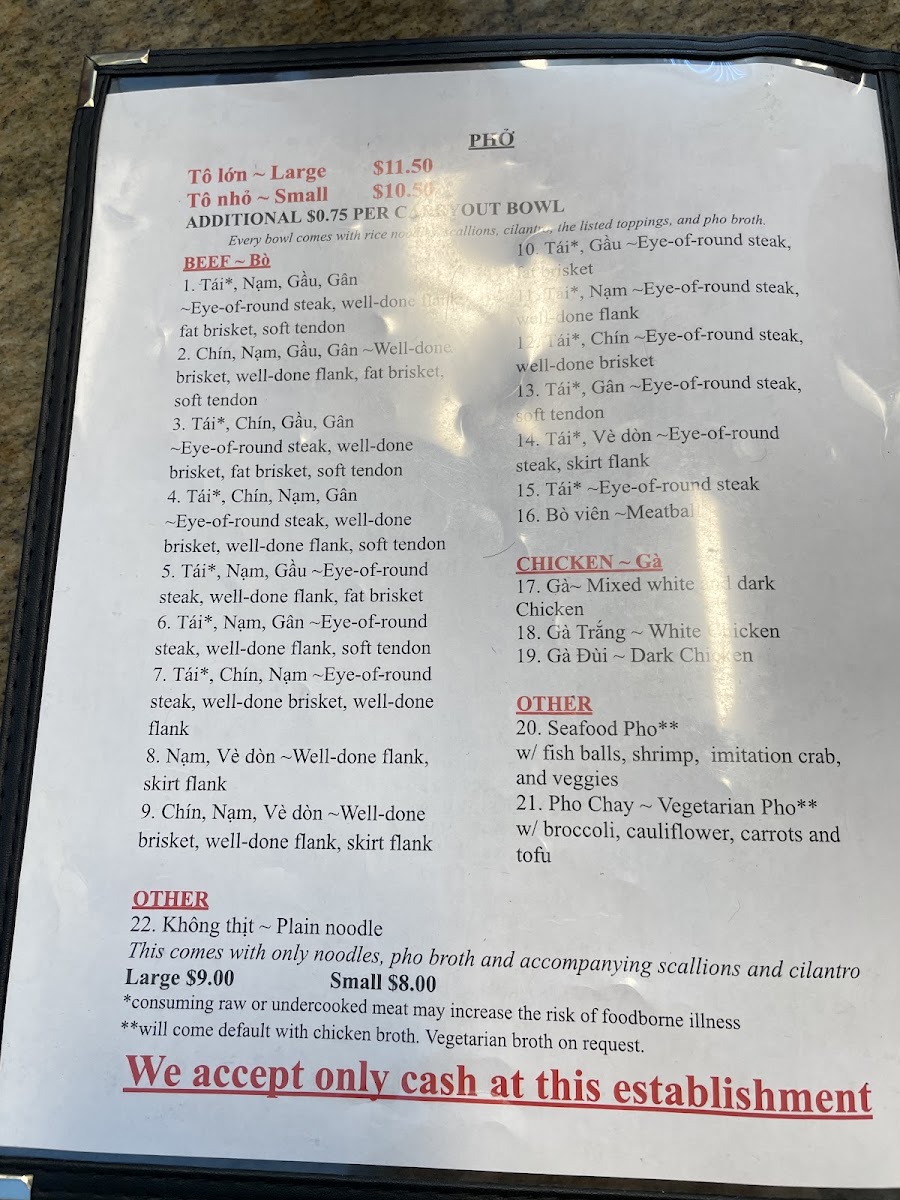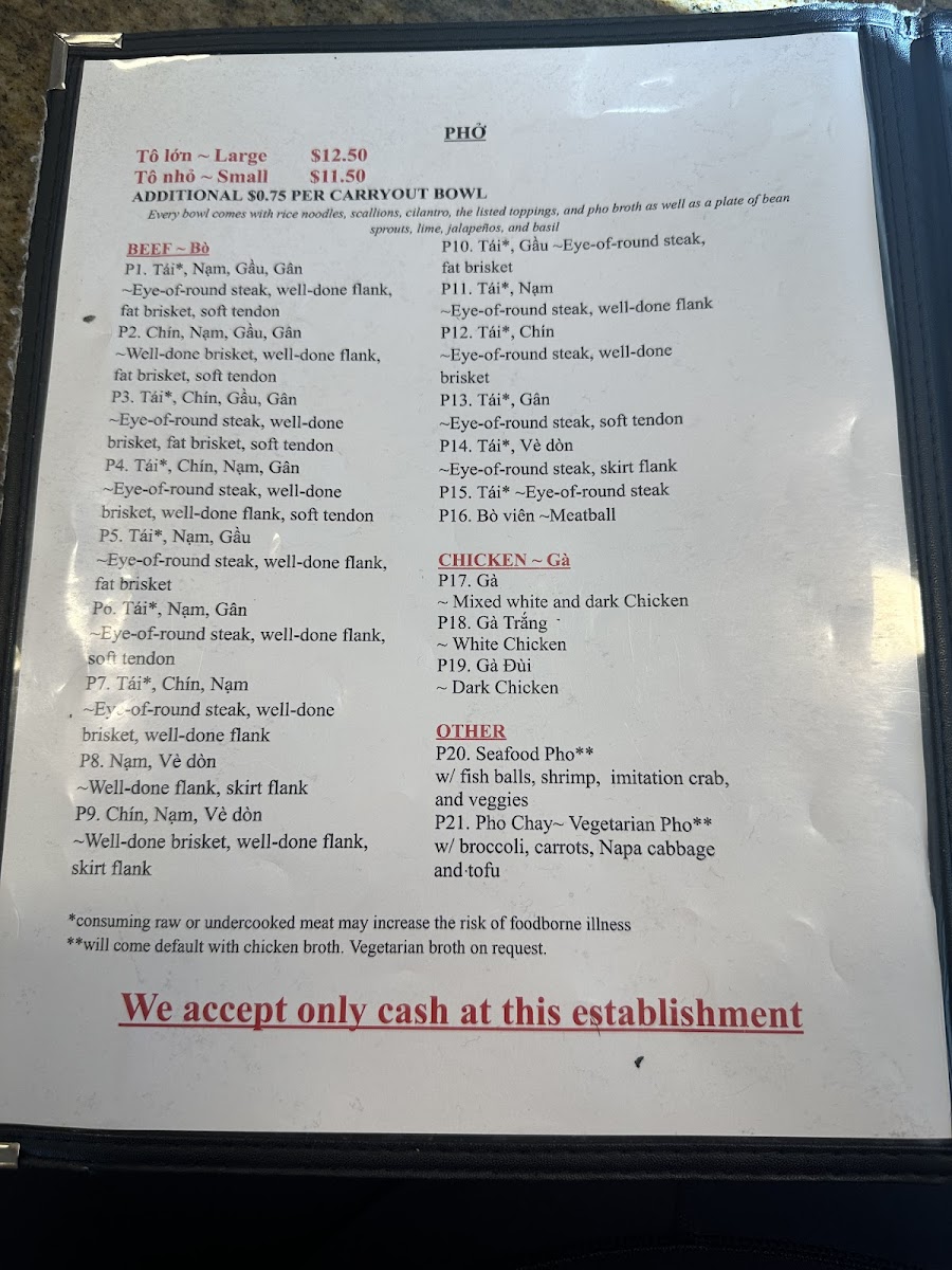 The menu is structured into categories such as soups, chef’s suggestions, and beverages, allowing for straightforward navigation and ordering. It caters to guests looking for casual dining experiences, suitable for lunch, dinner, or a quick meal. The focus remains on authentic pho preparations accompanied by complementary drinks and light snacks.
