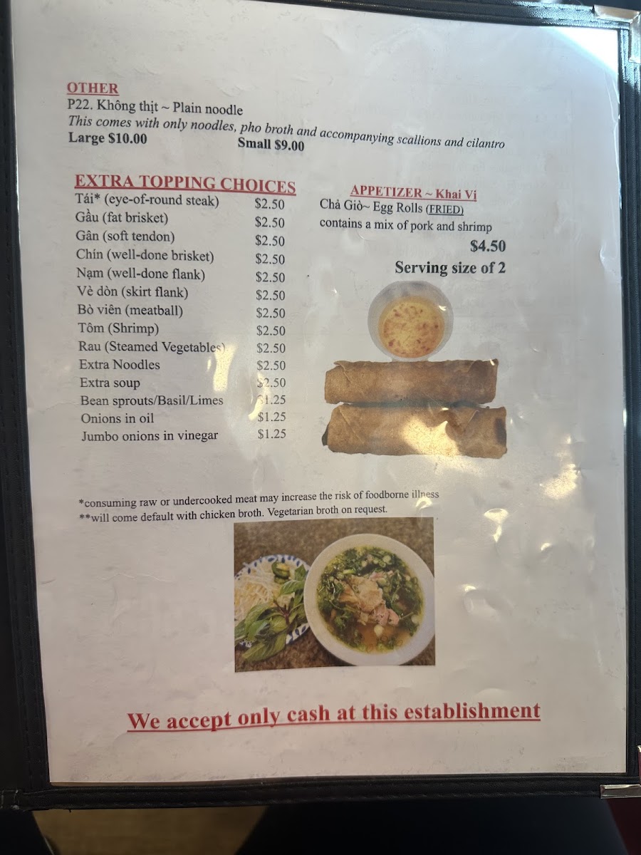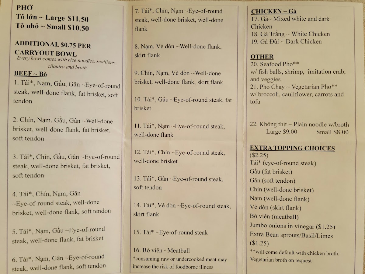 The menu offers a variety of traditional Vietnamese dishes, with a primary focus on pho, a popular Vietnamese noodle soup. The selection includes multiple pho variations featuring different cuts and preparations of beef, such as eye round steak, flank, brisket, tendon, and tripe, as well as seafood pho options. Additional pho toppings such as bean sprouts, basil, jalapeños, and lime are available to customize each order.