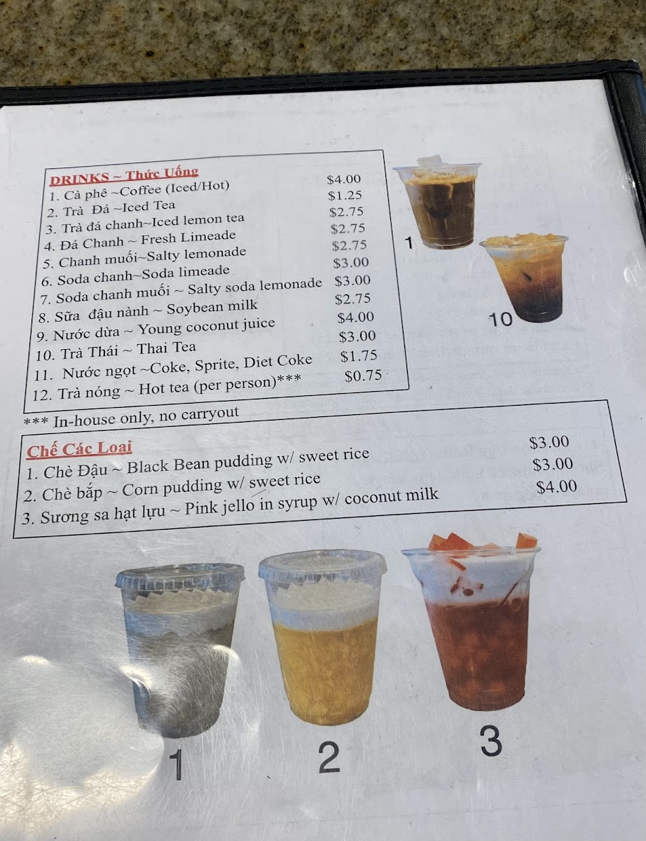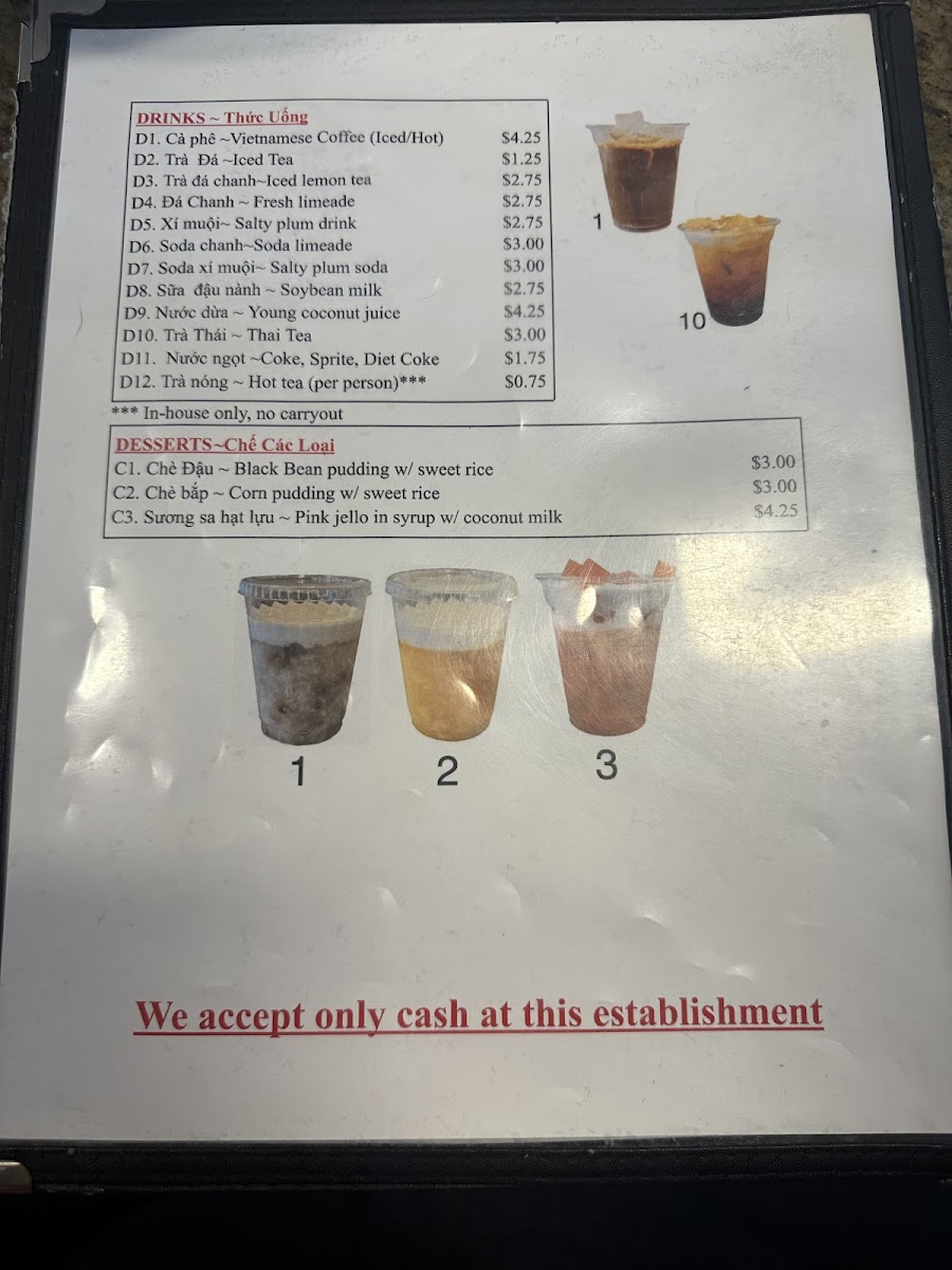 Besides pho, the menu includes appetizers like spring rolls and egg rolls, providing light bites to start the meal. The beverage selection features traditional Vietnamese-style coffees, including black drip coffee with or without condensed milk, as well as hot and iced teas. Other drink options include Thai iced tea, fresh lemonades, and a range of flavored iced juices such as salty pickled lemon and dried plum juice. Bubble tea is also available for those seeking a sweet and refreshing option.